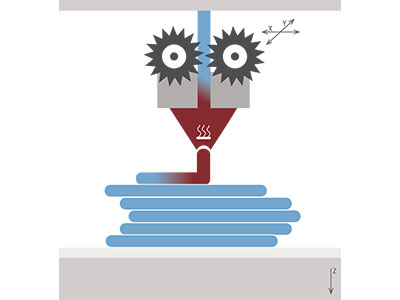 Beim FDM®-basierten 3D-Druck wird das drahtförmige Rohmaterial, welches auf einer Materialspule aufgewickelt ist, in einen in X- und Y- beweglichen Maschinenkopf gezogen. Hier wird das Material aufgeschmolzen, durch eine feine Düse extrudiert und als halbflüssiger Kunststoffstrang schichtweise unter hohem Druck auf einer Bauplattform wieder abgesetzt.