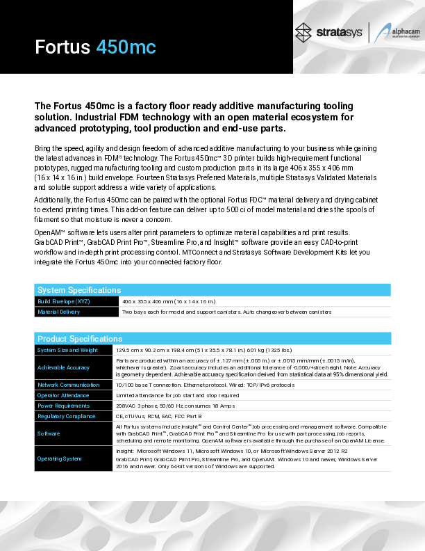 Der Fortus 450mc Gen3 3D-Drucker fertigt präzise, formstabile und langlebige Bauteile bis zu einer Größe von 406 x 355 x 406 mm aus einer großen Auswahl an hochwertigen Thermoplasten. Materialabhängig stehen bis zu 4 Schichtstärken zur Verfügung. Der Fortus 450mc verfügt über verschiedene Materialpakete und kann Hochleistungskunststoffe verarbeiten.