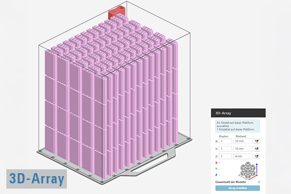 • 3D-Array: Erstellen Sie mehrere Kopien eines Modells in einem definierten Raster – ideal für Serien- und Kleinserienfertigung. Nutzen Sie den Bauraum maximal aus und reduzieren Sie Rüstzeiten.