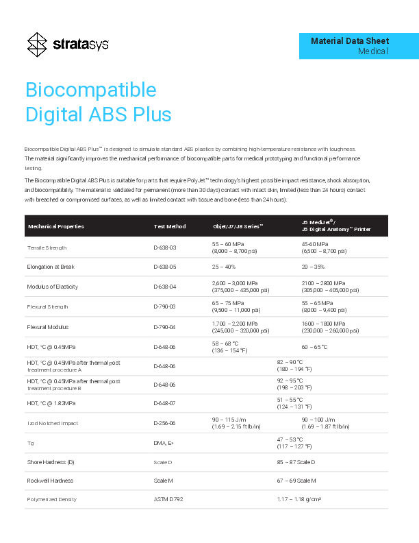 Biocompatibel Digital ABS Plus wurde entwickelt, um Standard-ABS-Kunststoffe zu simulieren, indem esTemperaturbeständigkeit mit Zähigkeit kombiniert. Das Material verbessert die mechanische Leistung von biokompatiblen Teilen für das medizinische Prototyping und die Funktionsprüfung erheblich. Es ermöglicht die Herstellung von sterilisierbaren und biokompatiblen Schnittführungsmodellen.