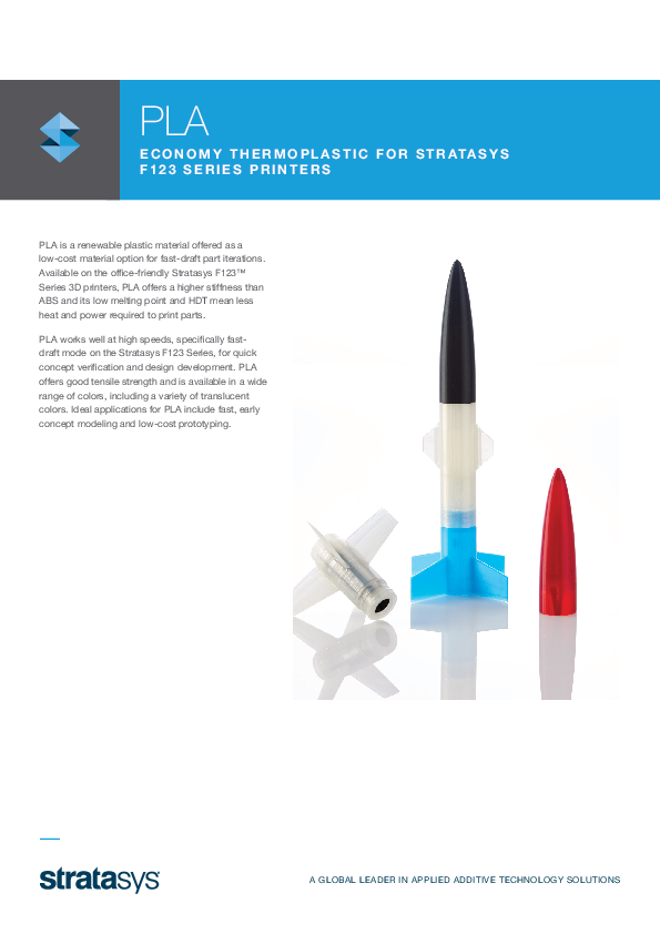 PLA ist eine preisgünstige Materialoption für die schnelle Entwurfsphase und wird aus nachwachsenden Rohstoffen hergestellt. Es bietet auf den bürofreundlichen Stratasys F123 3D-Druckern eine höhere Steifigkeit als ABS. Der niedrige Schmelzpunkt und die Wärmeformbeständigkeit bedeuten, dass weniger Wärme und Leistung für den 3D-Druck von Teilen benötigt wird.