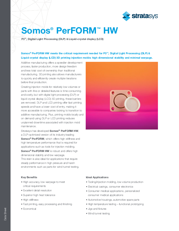 Somos® PerFORM HW ist eine für DLP-Drucker optimierte Version des branchenführenden Materials Somos® PerFORM, das dank seiner hohen Steifigkeit und Hochtemperaturbeständigkeit für Anwendungen wie die Fertigung von Werkzeugen für den Spritzguss geeignet ist.