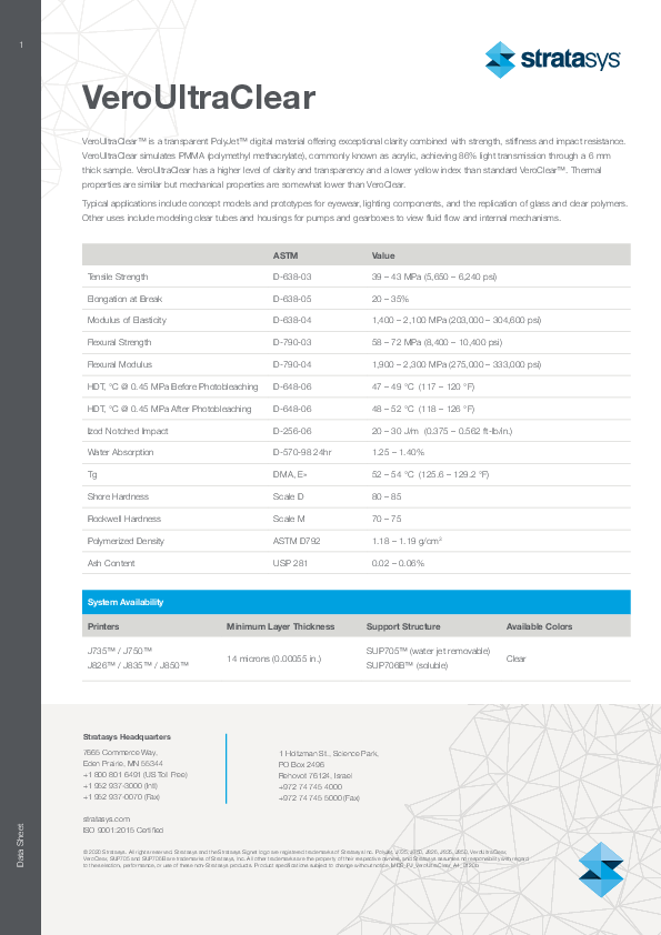VeroUltraClear ist ein transparentes PolyJet-Digital-Material, welches eine Lichtdurchlässigkeit von 86 % bei einer Bauteilstärke von 6 mm aufweist. Neben der außergewöhnlichen Transparenz, bietet VeroUltraClear Festigkeit, Steifigkeit und Schlagfestigkeit.