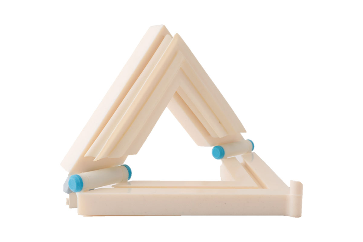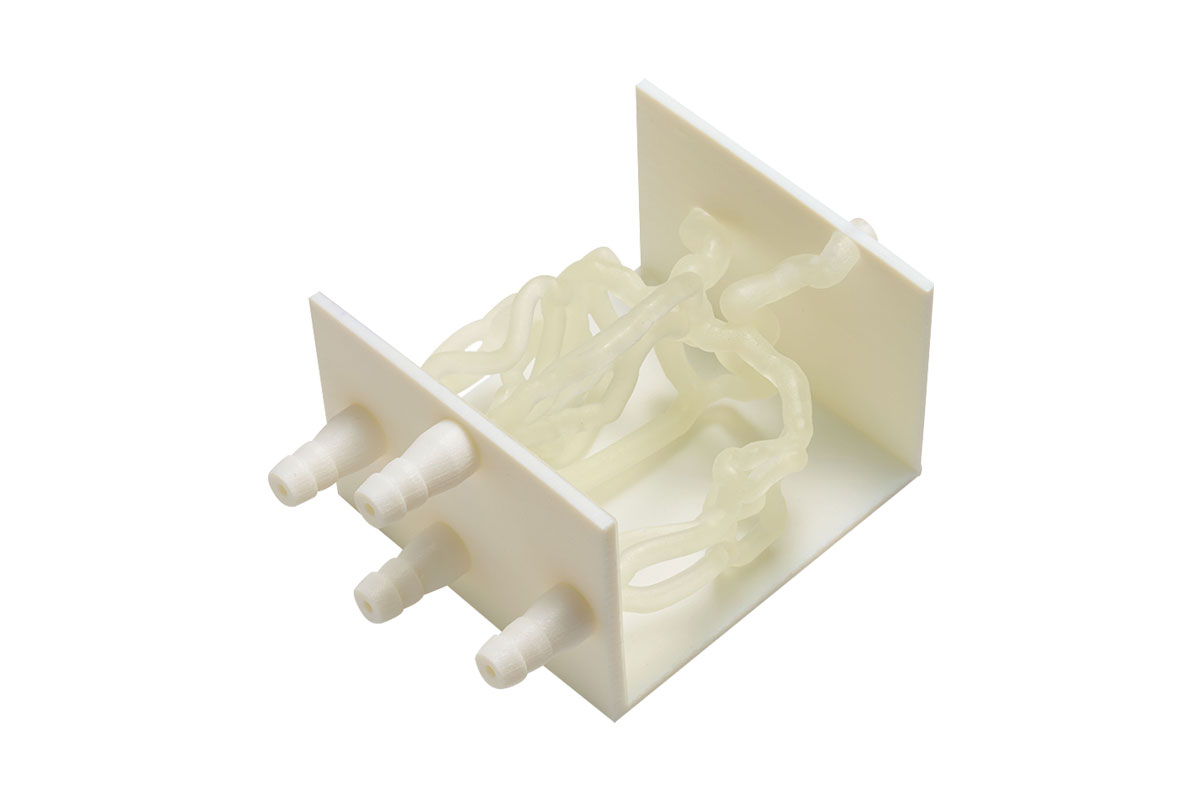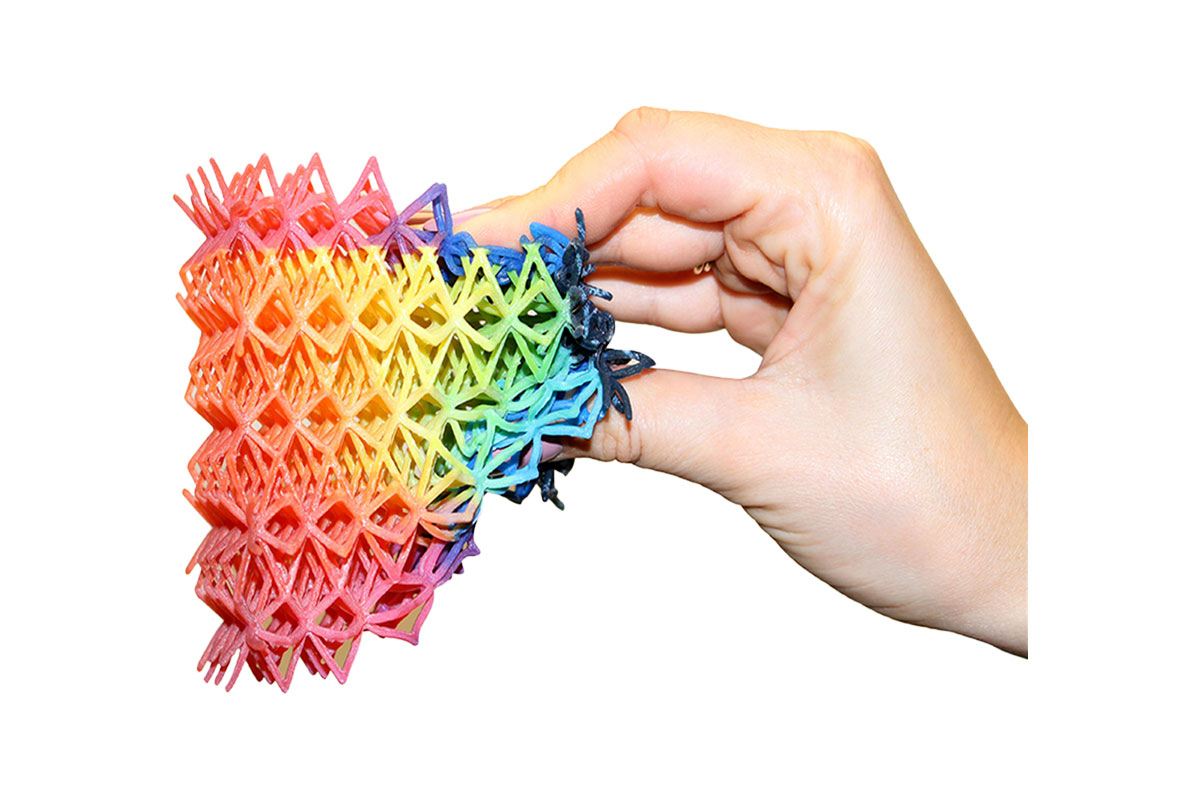 Dank der Multimaterial-Technologie, welche das gleichzeitige Verarbeiten und Mischen von bis zu 7 unterschiedlichen Materialien ermöglicht, lassen sich aus den flexiblen Materialien in Verbindung mit einem festen Werkstoff, mühelos 2K-Modelle (Hart/Weich) in einem Druckvorgang fertigen.